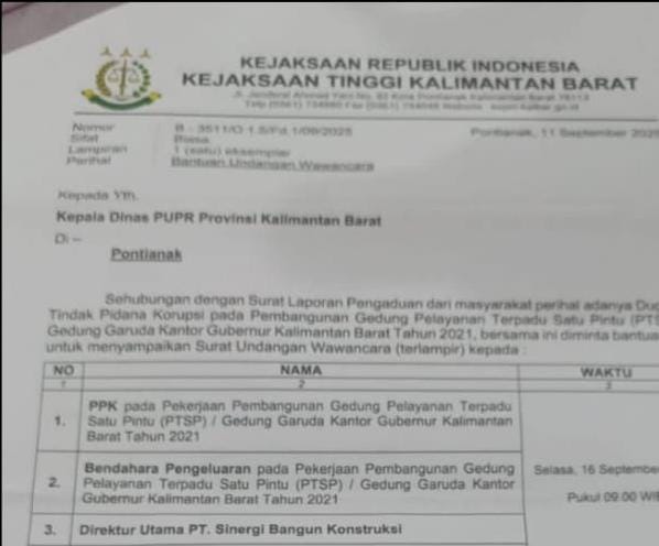 Pontianak Kalbar—faamnews.com – Langkah Kejaksaan Tinggi Kalimantan Barat memanggil Pejabat Pembuat Komitmen (PPK), Bendahara Pengeluaran, serta Direktur Utama kontraktor pelaksana proyek Pembangunan Gedung Pelayanan Terpadu Satu Pintu (PTSP) / Gedung Garuda Kantor Gubernur Kalimantan Barat Tahun Anggaran 2021 menandai fase krusial dalam pengujian akuntabilitas pengelolaan anggaran publik di Kalimantan Barat.