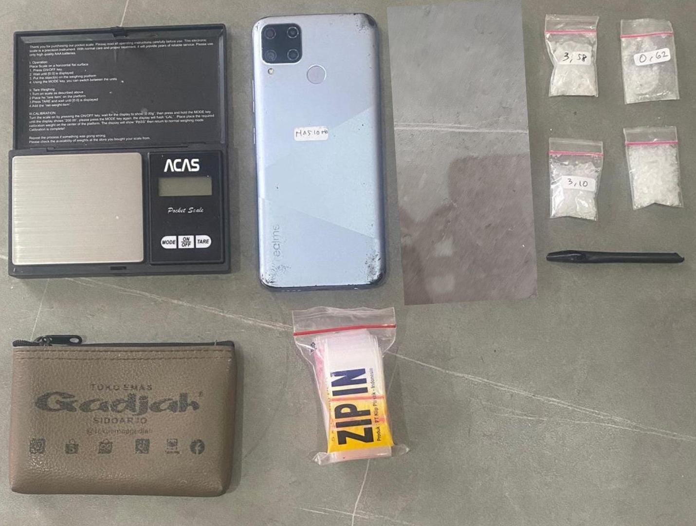 Kasat Yoyok juga menuturkan bahwa dari tangan NO, jajarannya berhasil mengamankan empat poket sabu dengan total berat 9,221 gram, satu timbangan elektrik, satu scop yang terbuat dari sedotan, satu klip plastik kosong, satu dompet warna coklat, serta sebuah ponsel Realme warna silver yang digunakan tersangka sebagai alat transaksi.